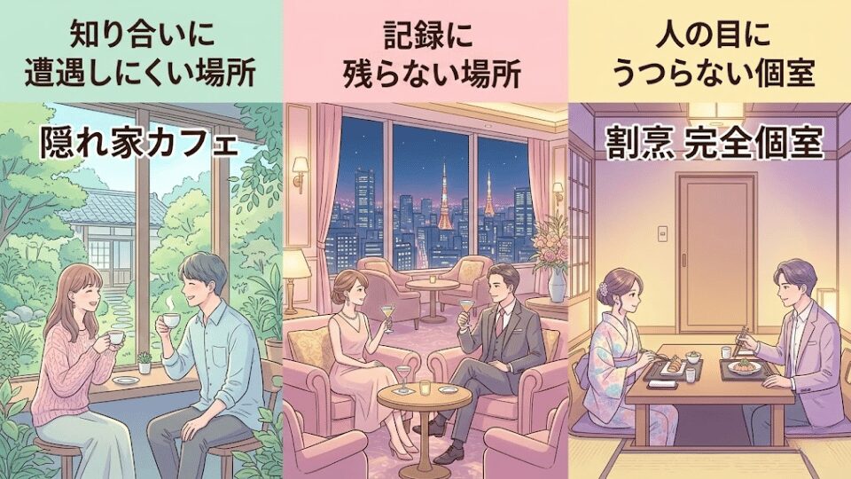 - 密会場所は「生活圏外」「現金払い」「完全個室」の3条件を基準に選ぶ